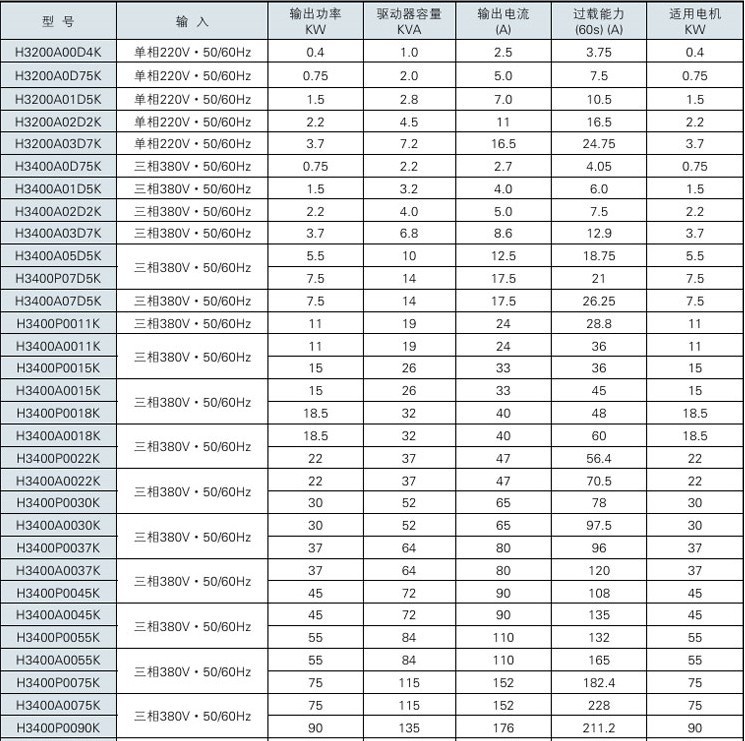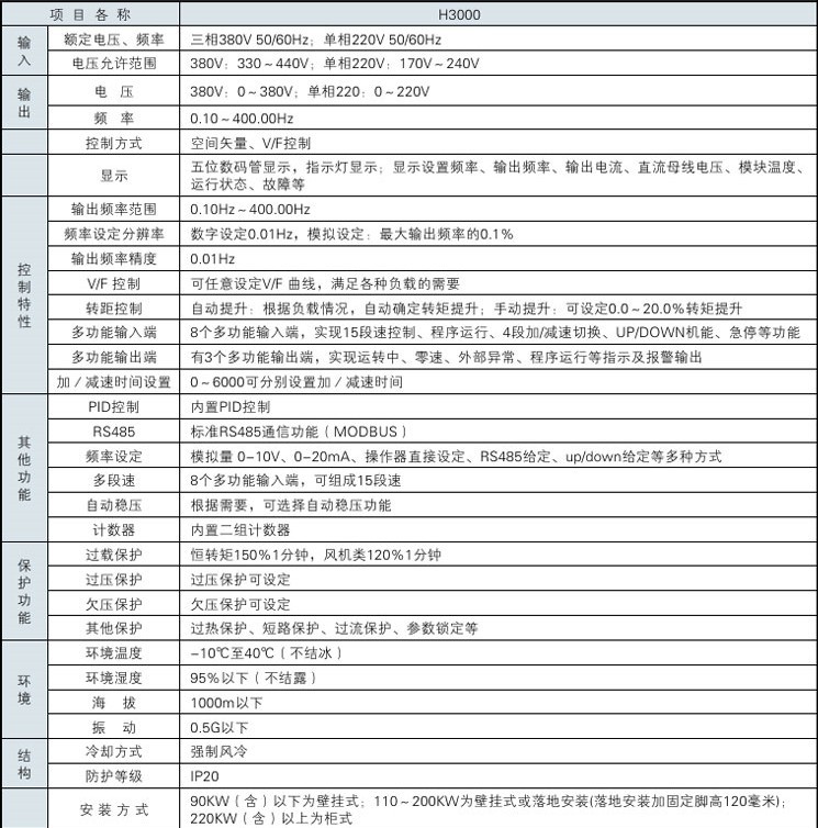 系列名稱:H3000系列通用型變頻器 額定電壓、頻率:三相380V 50/60Hz;單相220V 50/60Hz 電壓允許范圍:380V:330~440V;單相220V:170V~240V 電壓:380V:0~380V;單相220:0~220V 頻率:0.10~400.00Hz 控制方式:空間矢量、V/F控制···