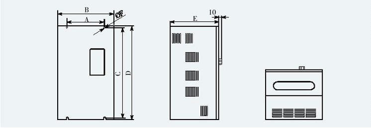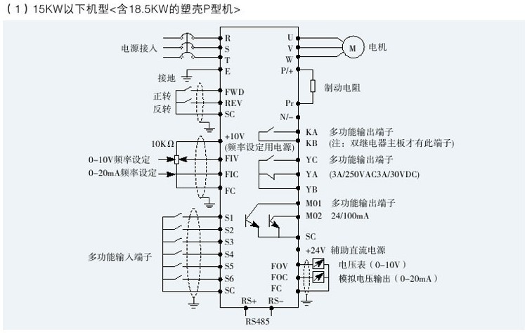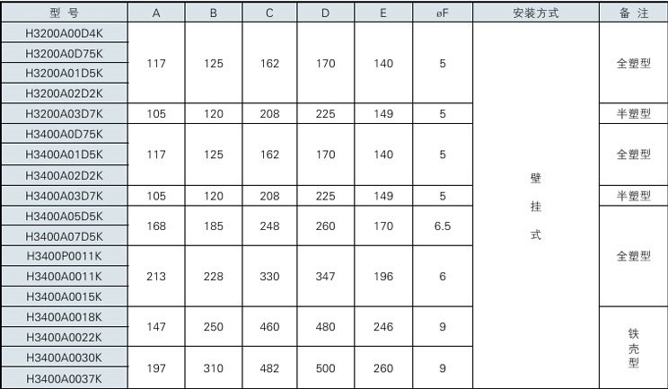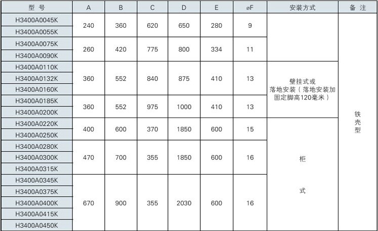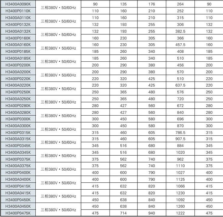 備注:A型機(jī)為恒轉(zhuǎn)矩變頻器,P型機(jī)為變轉(zhuǎn)矩變頻器。P型機(jī)適用于風(fēng)機(jī)水泵類設(shè)備。